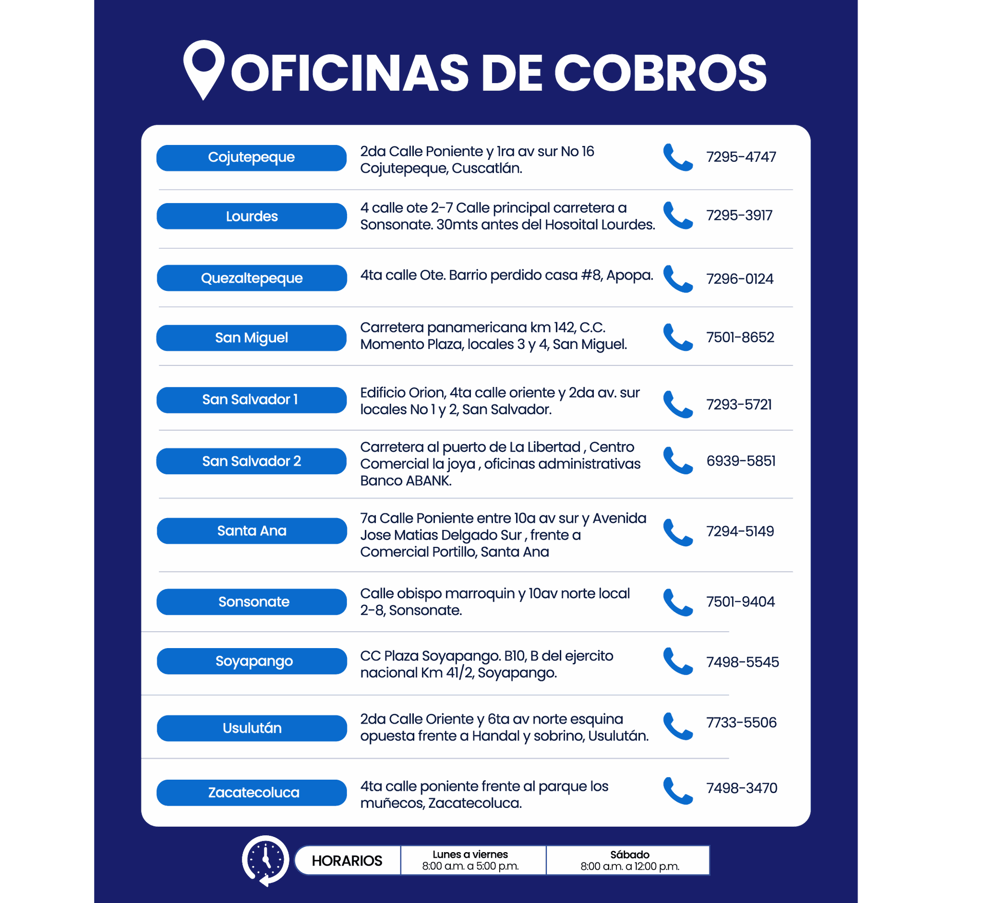Banco ABANK Cojutepeque 2da. Poniente. No 16, Cojutepeque, Cuscatlán Horario: Lunes - Viernes: 8:00 a.m. - 5:00 p.m. Sábado: 7:30 a.m. - 12:00 p.m. |