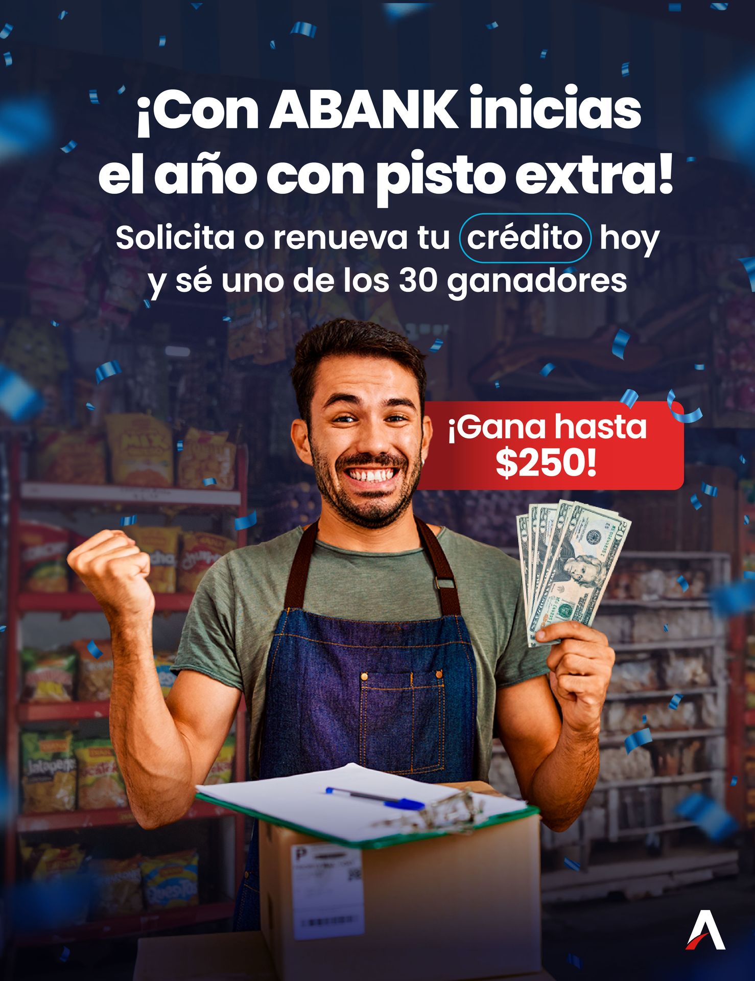 Promoción válida del 15 de septiembre al 15 diciembre 2025. Participan todos los clientes que soliciten o renueven su crédito en ABANK y realicen sus pagos puntuales durante la vigencia de la promoción. Fecha del sorteo 22 de diciembre 2025, serán 30 ganadores de hasta $250. Ver bases y condiciones de la promoción