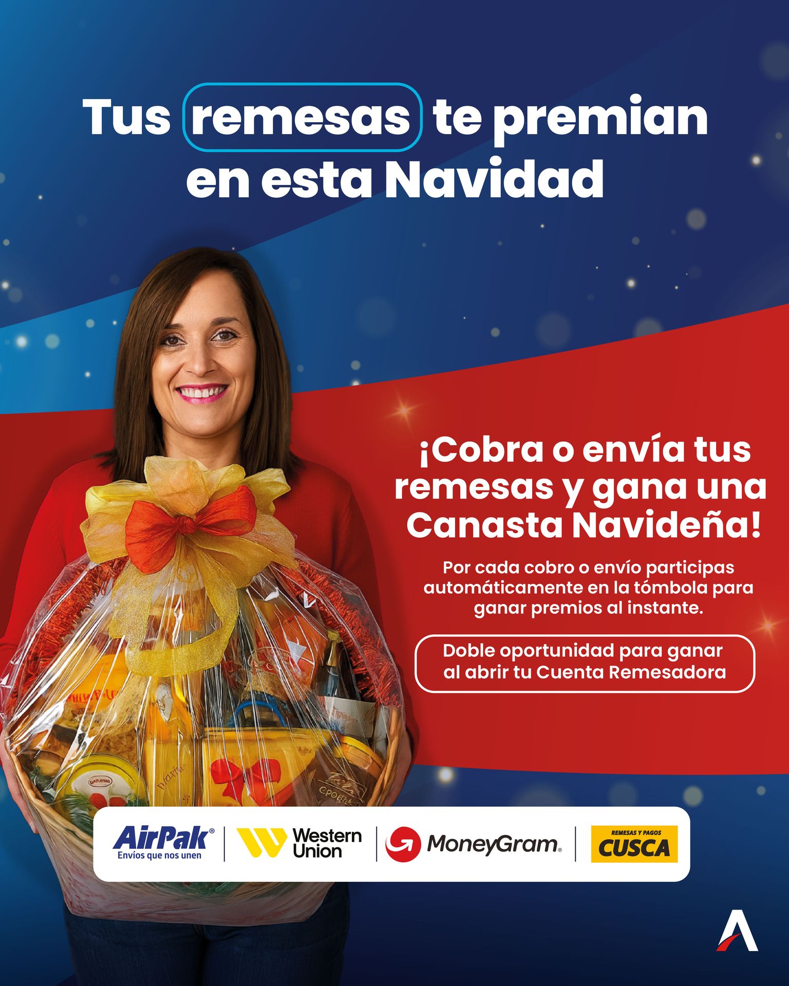 Promoción válida del 1 al 30 de diciembre 2025 o mientras duren existencias. Participan en la tómbola para ganar una canasta navideña o premios al instante todos los clientes que realicen un cobro o envío de remesas. Doble oportunidad de ganar al abrir una Cuenta Remesadora. Promoción válida en las 20 agencias de Banco ABANK. Consulta más información aquí, en agencias o comunícate a la Línea ABANK al 2537-6060. Imagen con fines ilustrativos